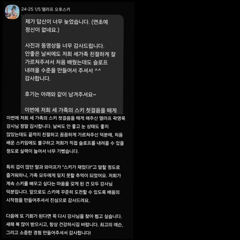 "여러분의 특별한 순간을 함께 할 수 있어 감사합니다. 스키장을 처음 접하시는 분부터 실력을 한 층 끌어올리고 싶으신 분까지, 맞춤형으로 즐겁고 안전하게 자신감을 쌓아가는 경험을 선사하겠습니다."